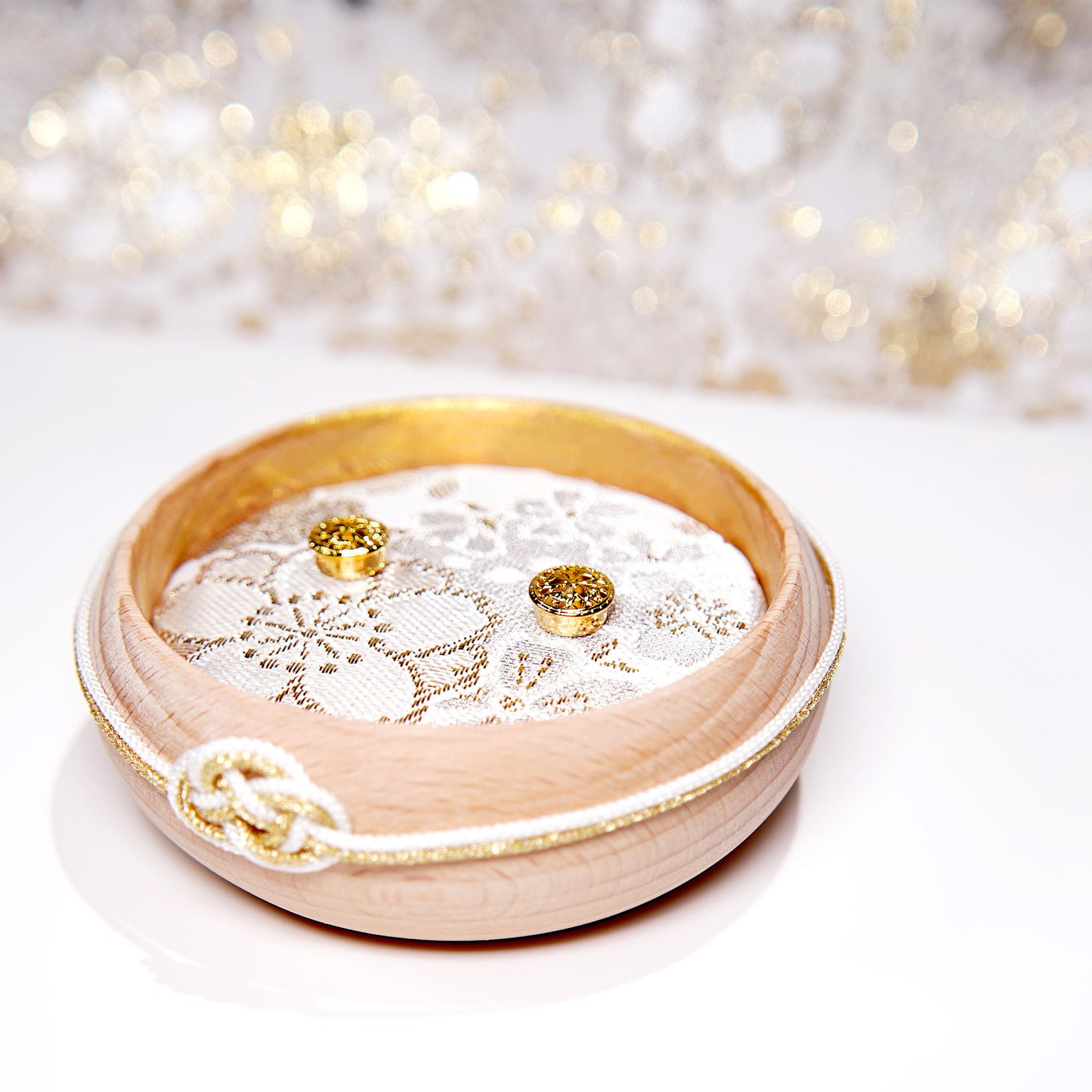 木のナチュラルな風合いに、金桜の美しさは、特別な日をさらに輝かせ、温もりを感じさせるデザインです。